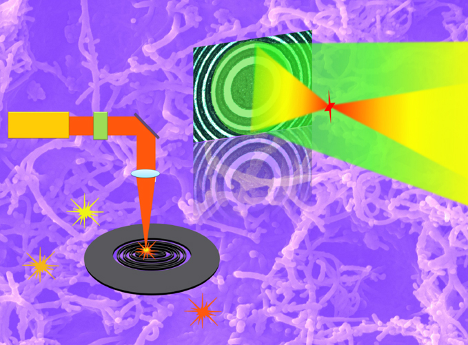 Left: Laser direct writing FZP lens on carbon nanotubes based buckypaper. Right: the fabricated buckypaper lens works in refection mode. Background: SEM picture of the buckypaper, within which entangled carbon nanotubes could be seen clearly.