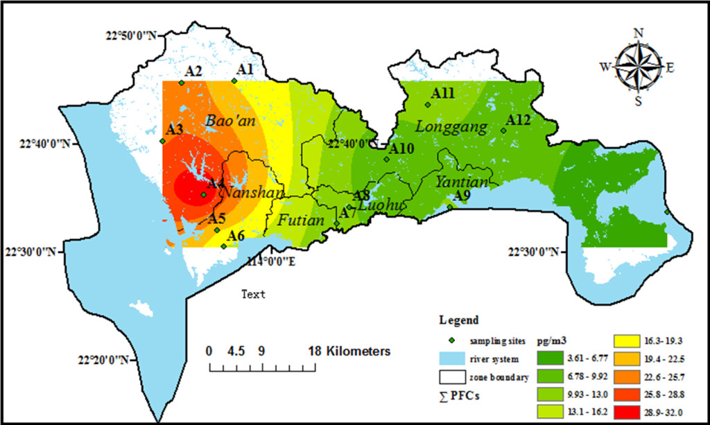 High volume air samples taken to 13 sampling sites that were chosen in 6 districts of Shenzhen, China from September to November, 2011 were analyzed for 11 perfluorinated compounds (PFCs). A set of ionic nonvolatile PFCs including two perfluoroalkyl sulfonic acids (PFSAs, C6 and C8) and perfluoroalkyl carboxylic acids (PFCAs, C4-12) were collected on polyurethane foam – based passive air samplers (PUF – PASs) and determined using high performance liquid chromatography-negative electrospray ionization-tandem mass spectrometry (HPLC/ESI-MS/MS). PFCs were detected in all air samples, even in the background sample, indicating the widespread contaminations of PFCs in the atmosphere of Shenzhen. Total PFC concentrations (∑ PFCs) of the samples ranged from 3.4 to 34 pg·m-3 with an average of 15 pg·m-3. ∑ PFCs decreased from west to east of Shenzhen, which was related to industrial distribution, population density, and environmental climate (Fig. 1).
